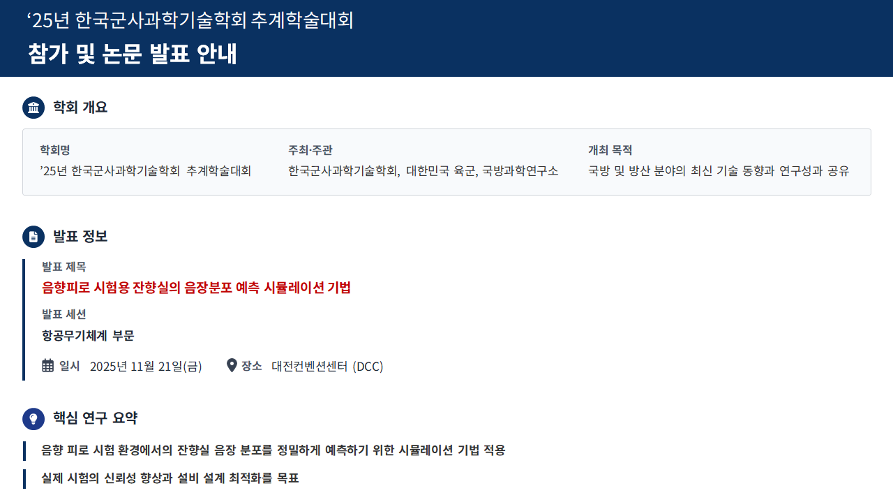 이번 「’25년 한국군사과학기술학회 추계학술대회」에 당사가 참가하여 연구 성과를 발표할 예정입니다.