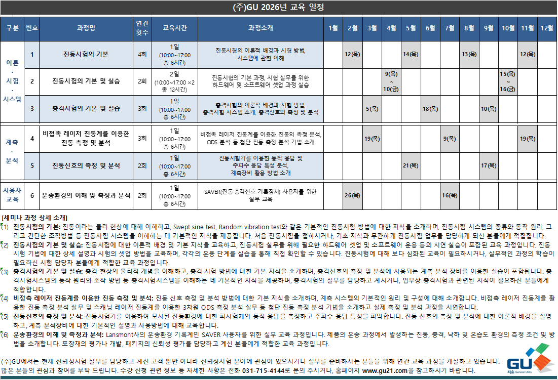 ㈜G.U.에서는 매년 업계 전문가와 함께 실무 중심의 기술 교육을 진행하고 있으며, 2026년도 교육 일정을 아래와 같이 안내드립니다.